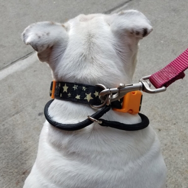 To have a better idea of how that looks, you can check out the picture of Molly sporting both her Halloween and security collars. As another measure is safely, we keep our group strolls to a maximum of four dogs.